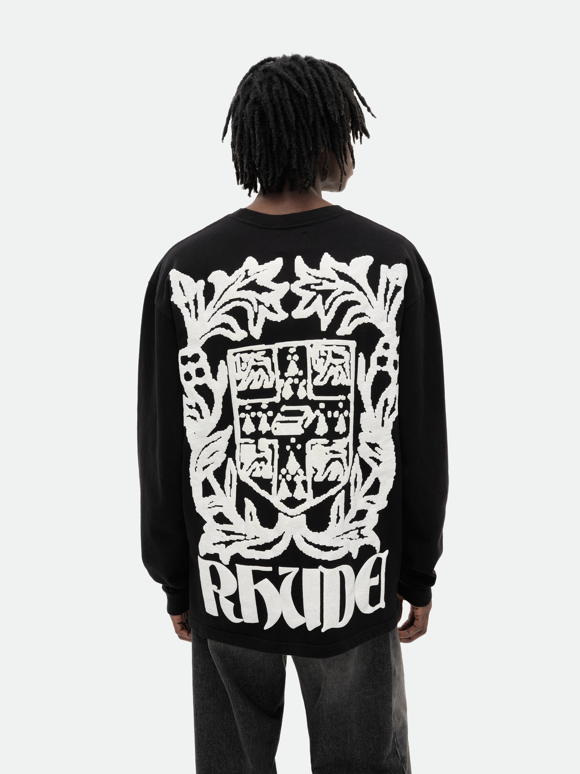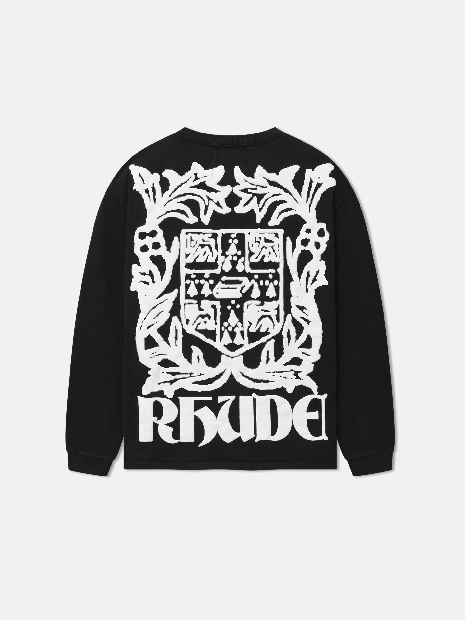Premium long sleeve tee crafted from soft, lightweight fabric. Features a comfortable and relaxed custom Rhude fit. Ribbed neck and sleeves, with Rhude Crest graphics on front and back in custom puff print.