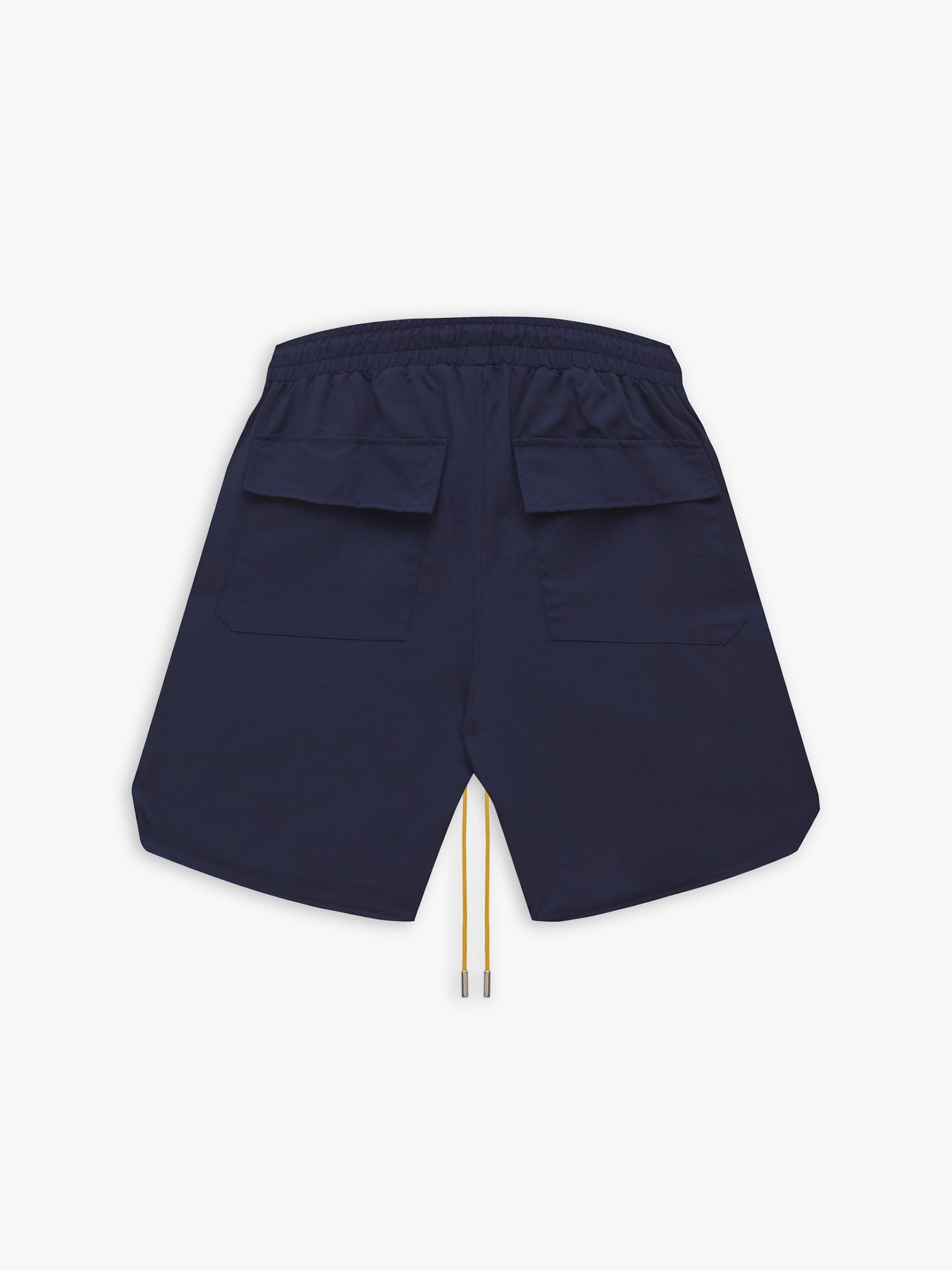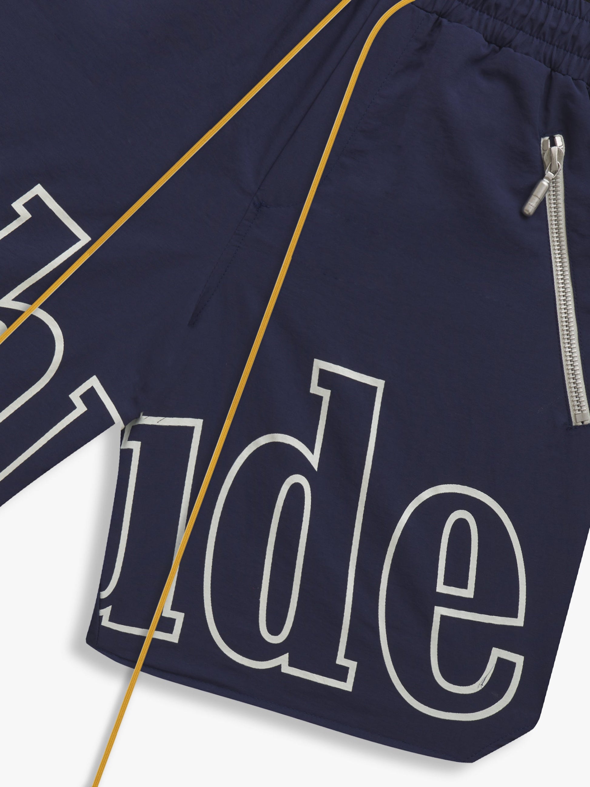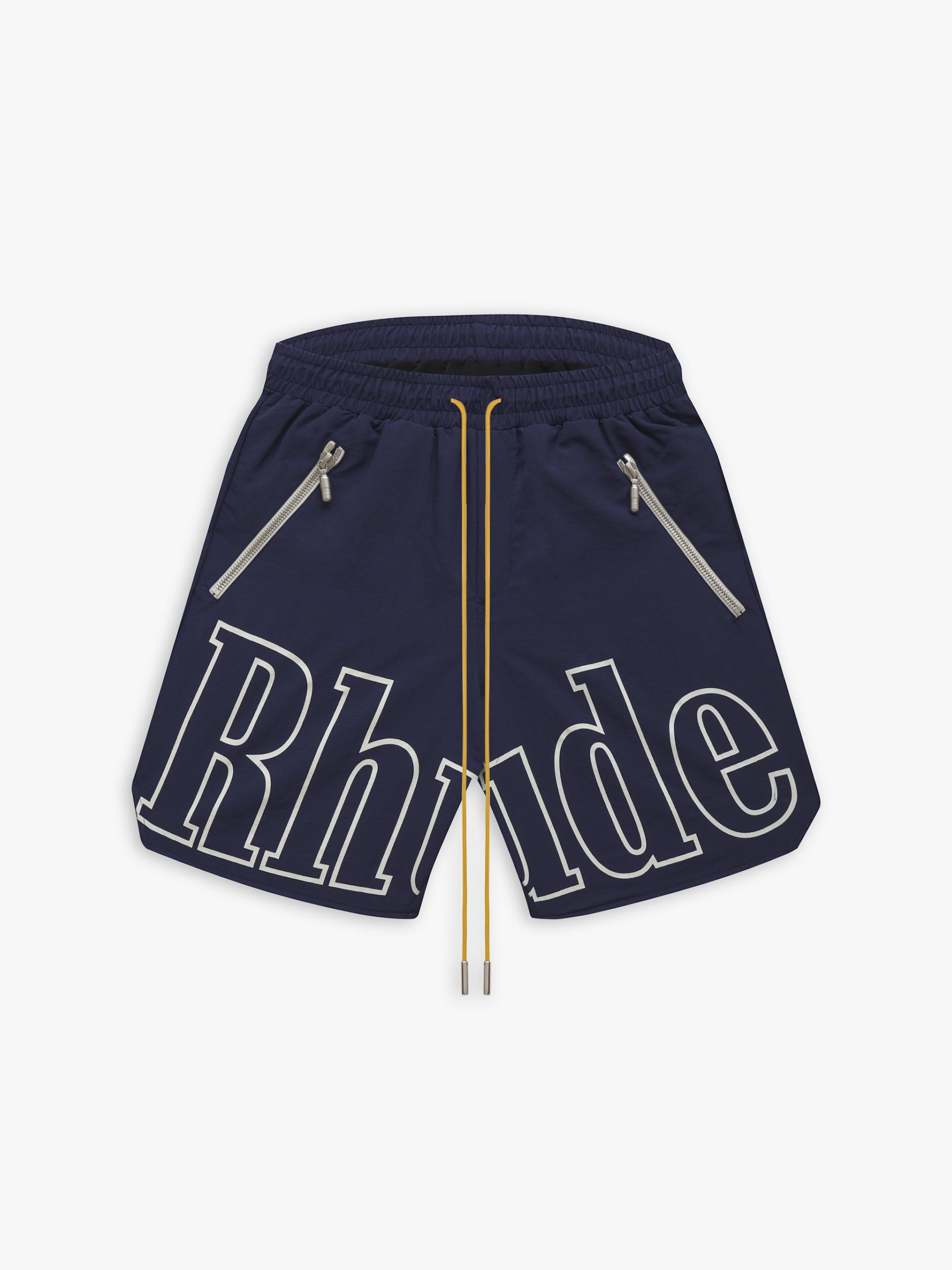 Premium washed nylon short with rhude logo print across front legs.. TWIN ZIPPER POCKETS WITH MATCHING TONAL RHUDE PILL HARDWARE. EXTENDED DRAWSTRINGS IN OUR SIGNATURE MUSTARD TONE.