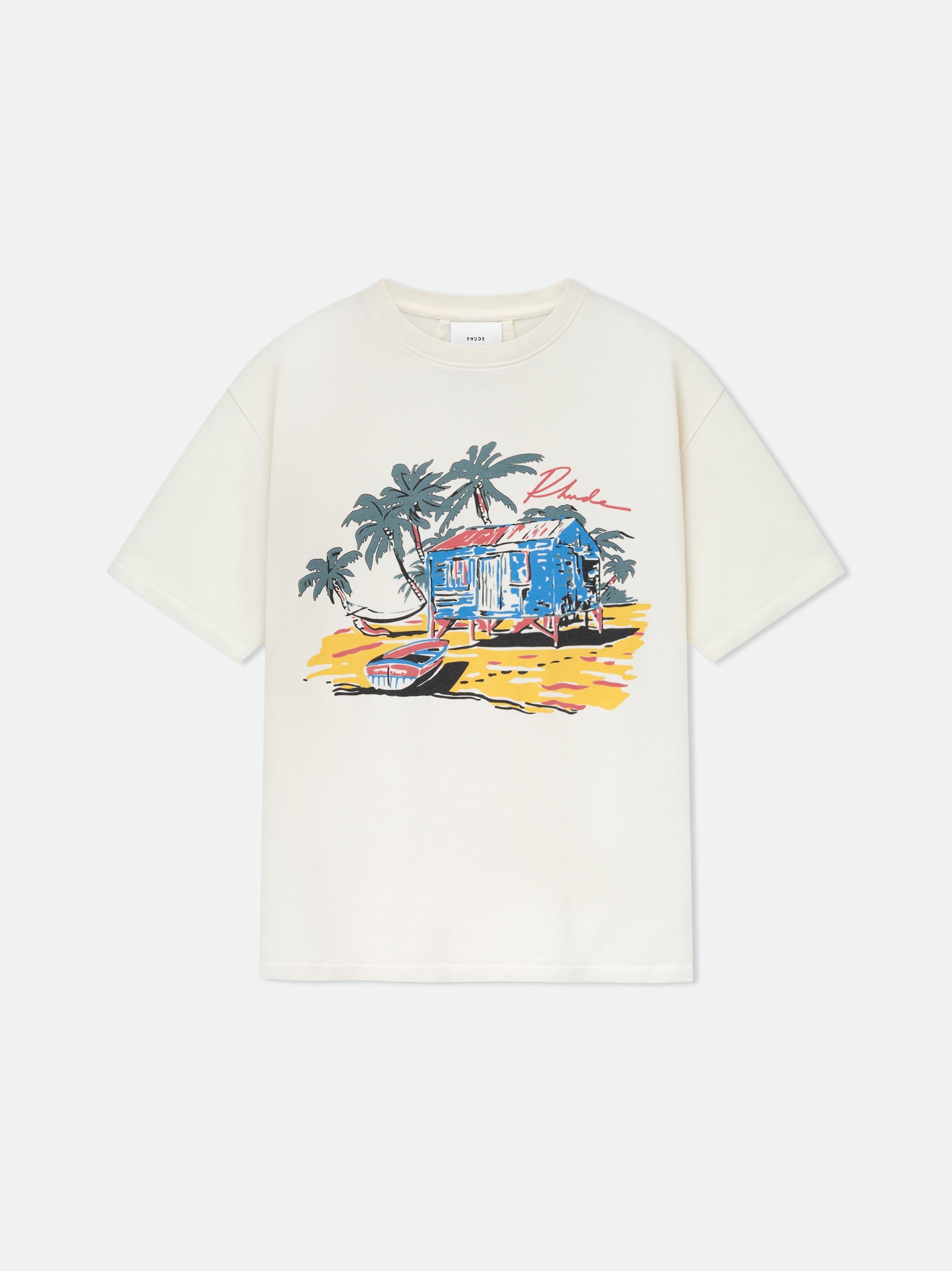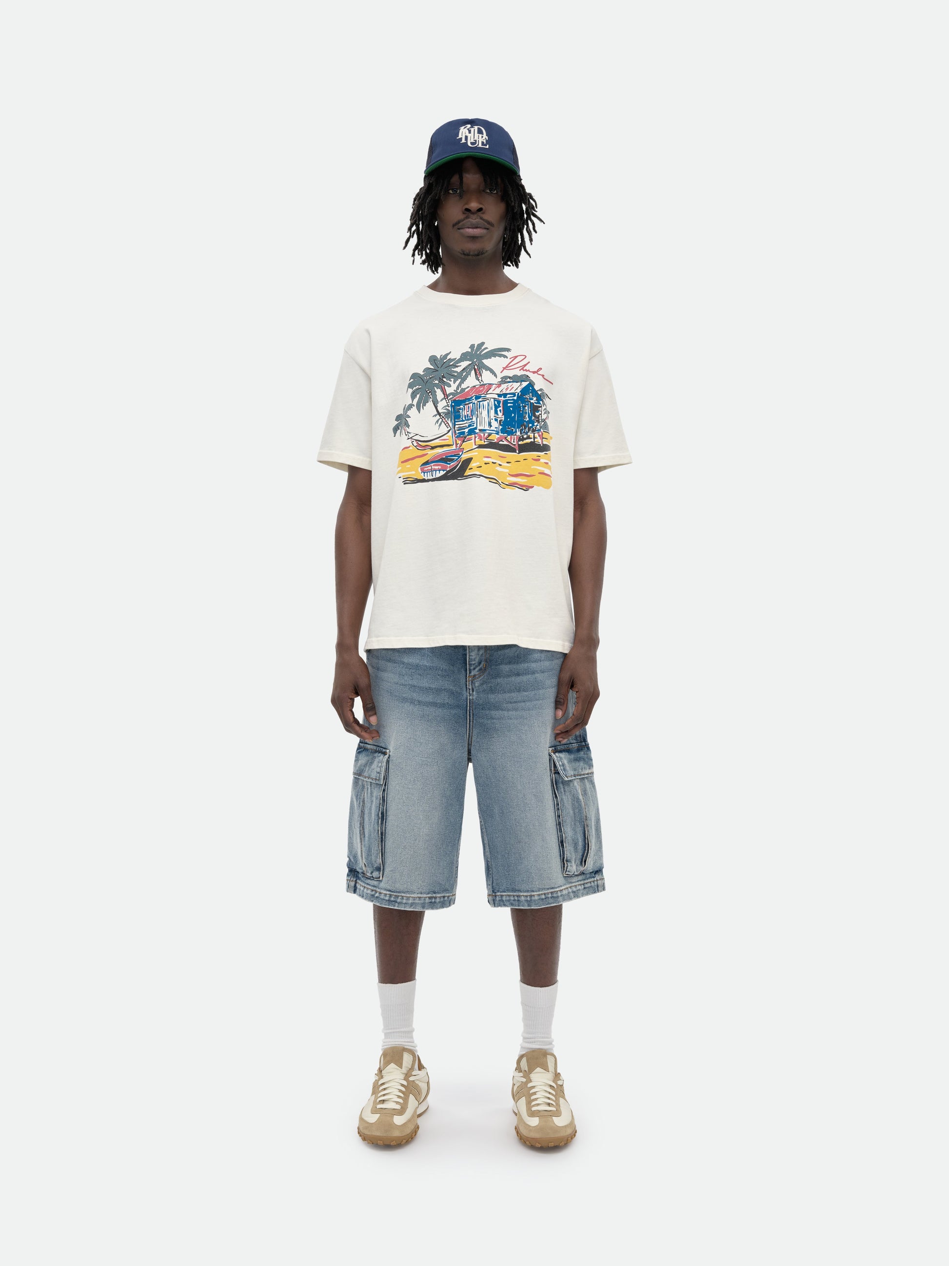 Custom-fit vintage wash cotton short sleeve tee-shirt with Rhude beach side graphic printed on the front, with a clean back.