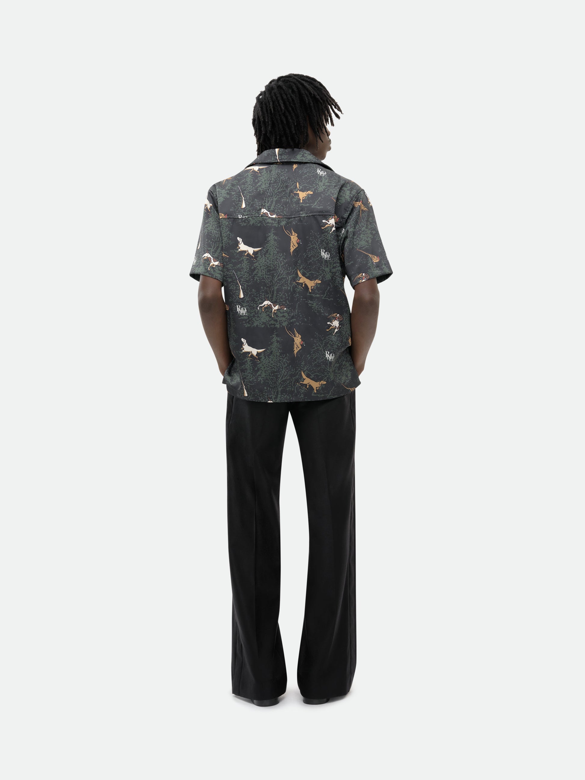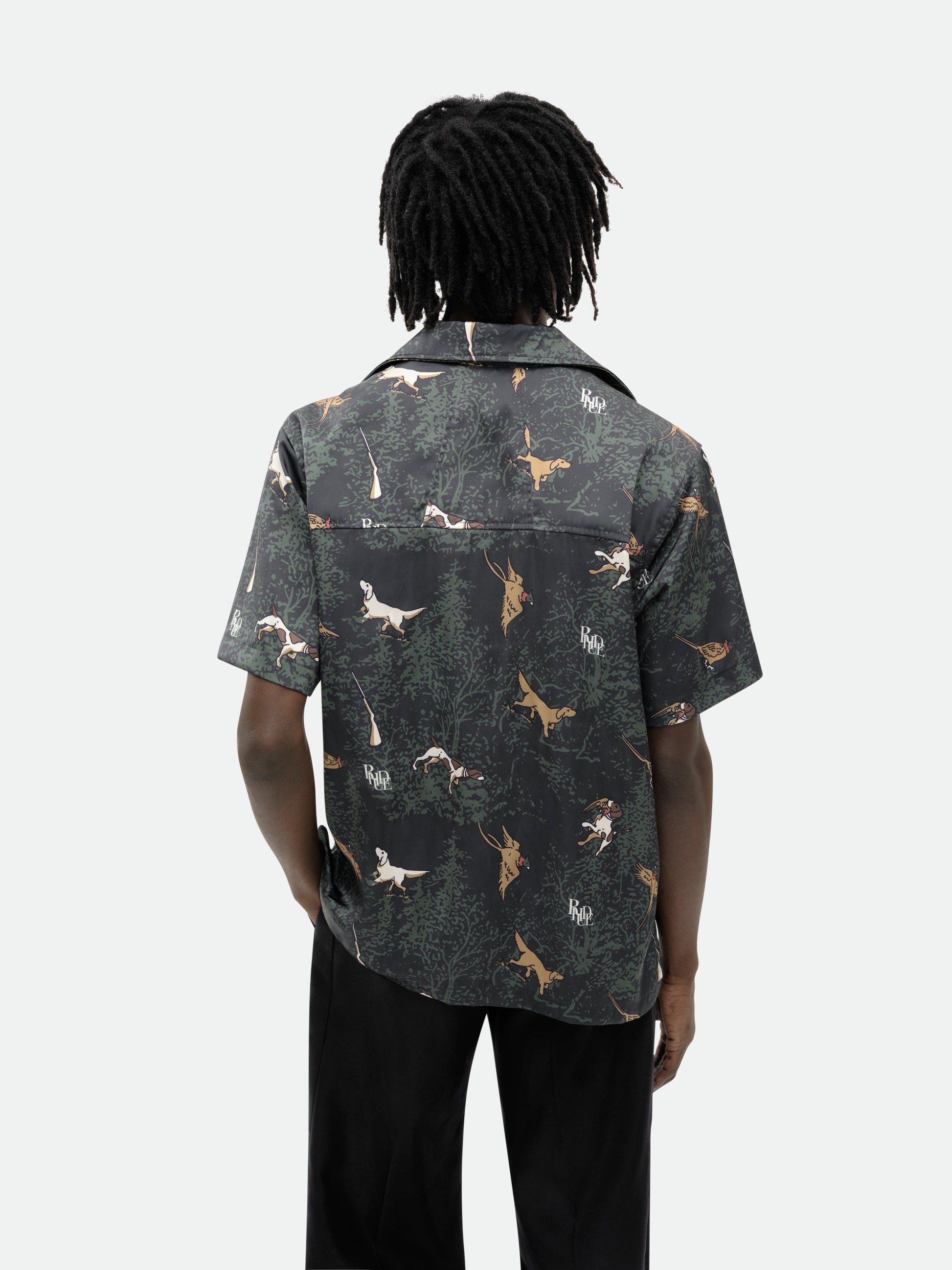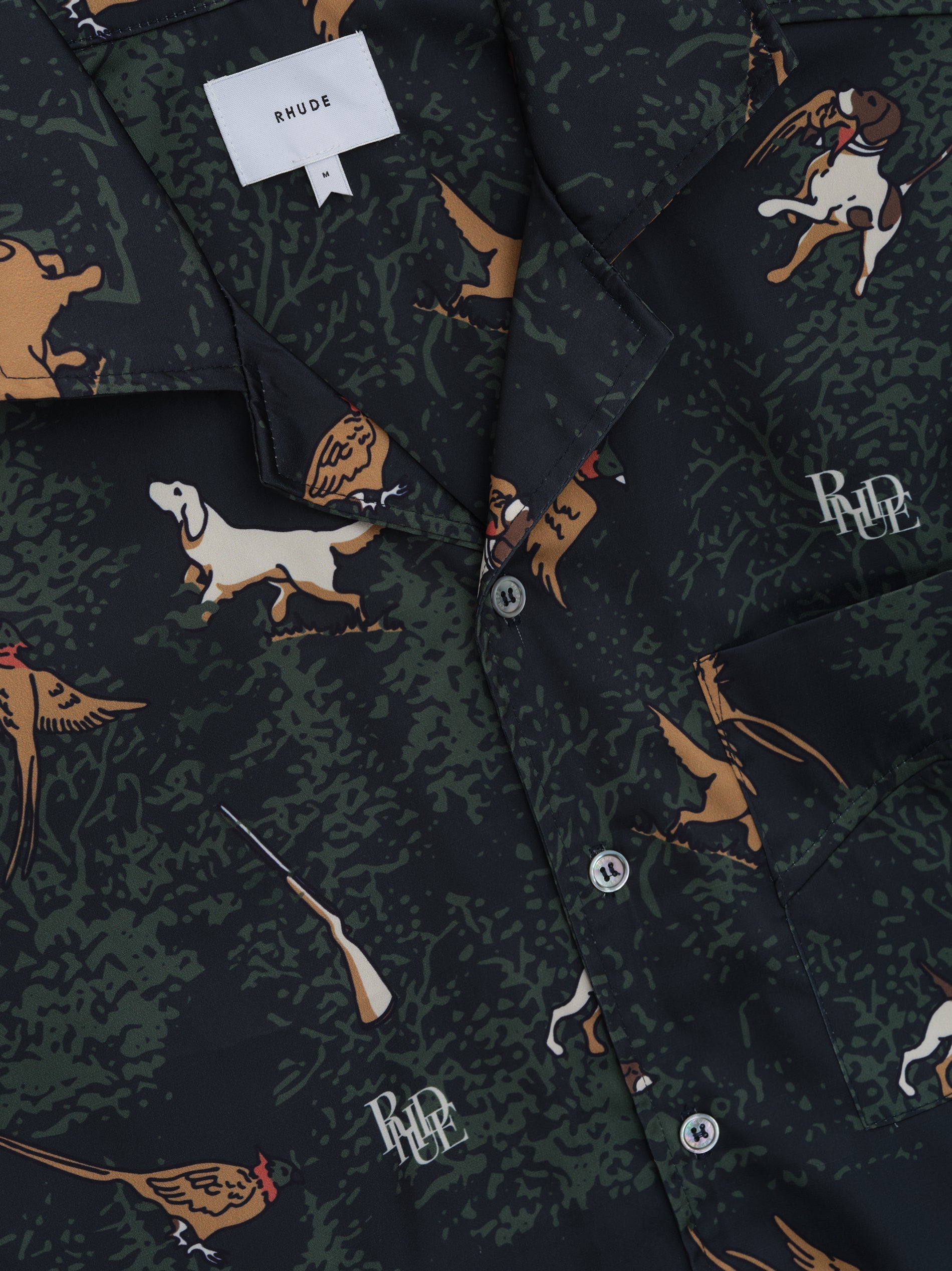 Classic button up shirt crafted from heavyweight satin. Featuring a flat hem, custom button closures at front, and RHUDE dog designs all over.