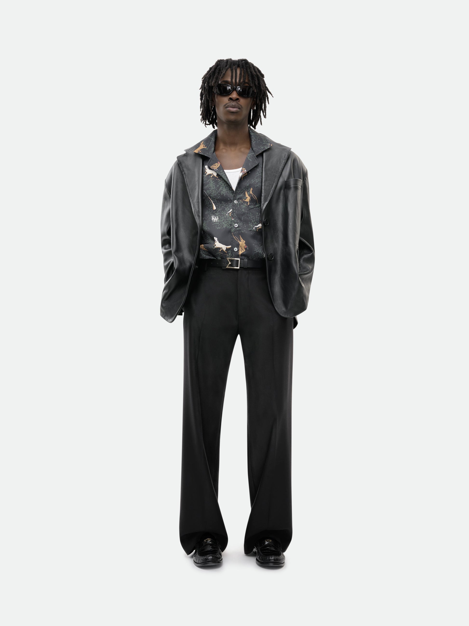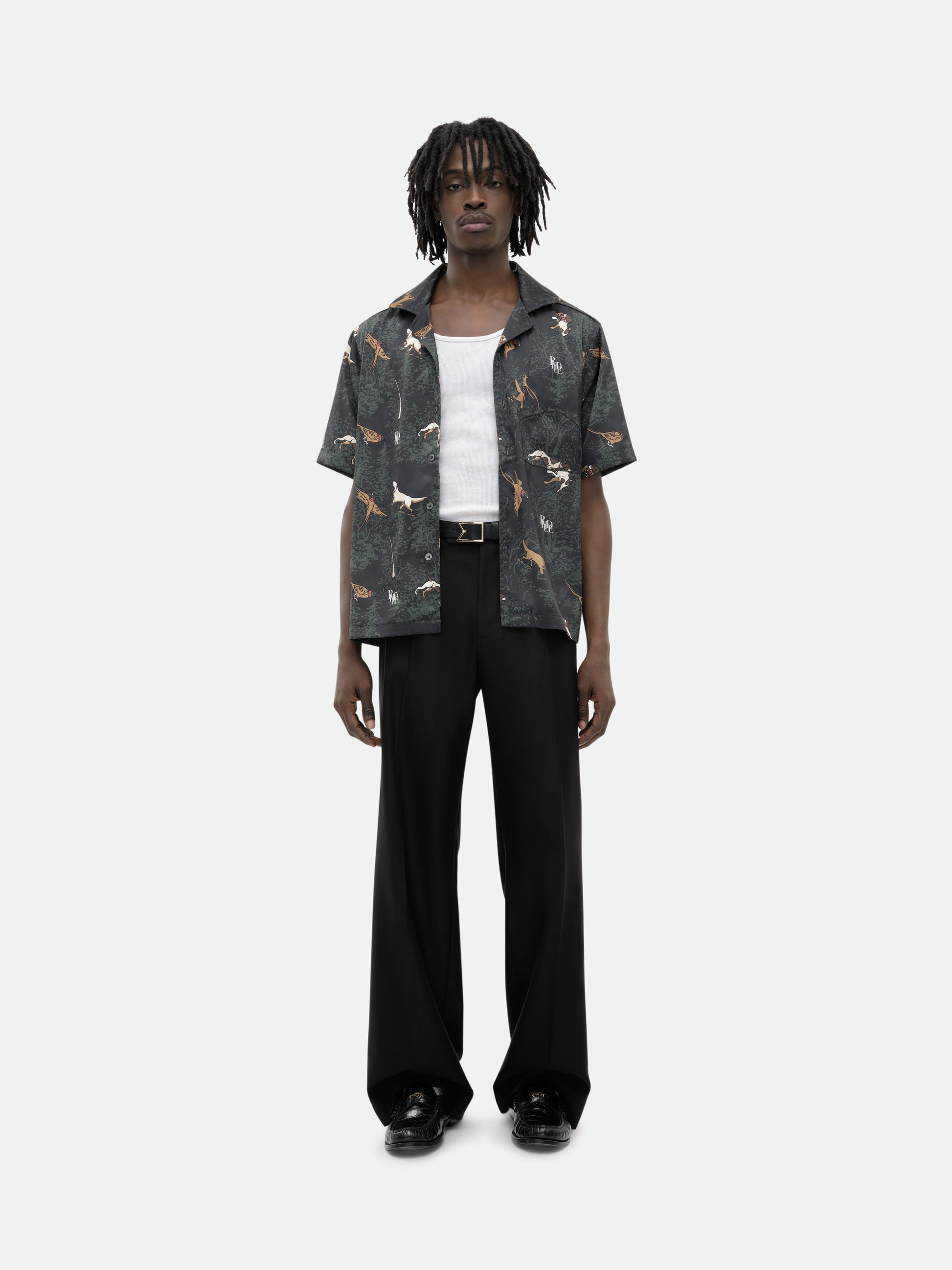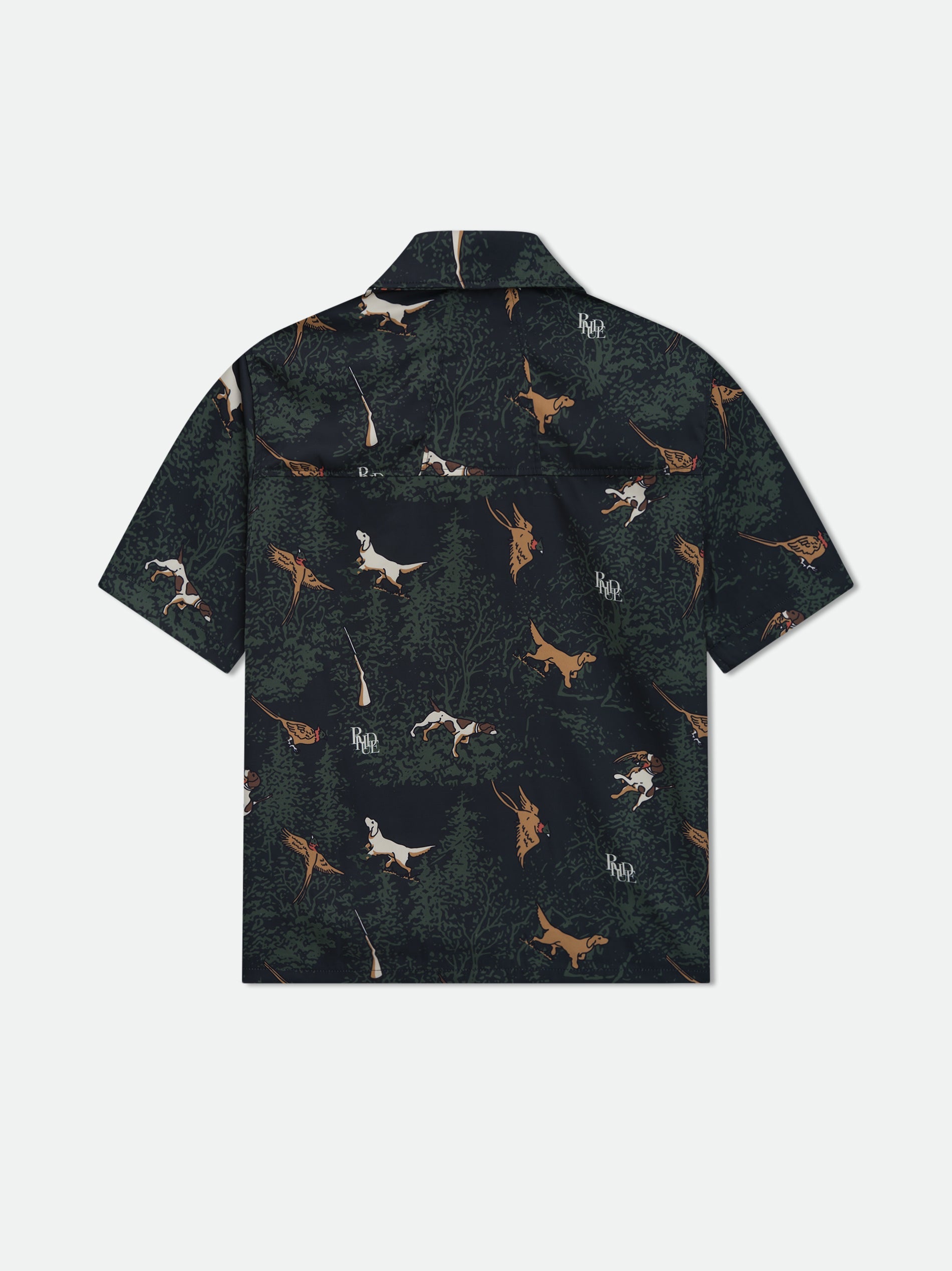 Classic button up shirt crafted from heavyweight satin. Featuring a flat hem, custom button closures at front, and RHUDE dog designs all over.