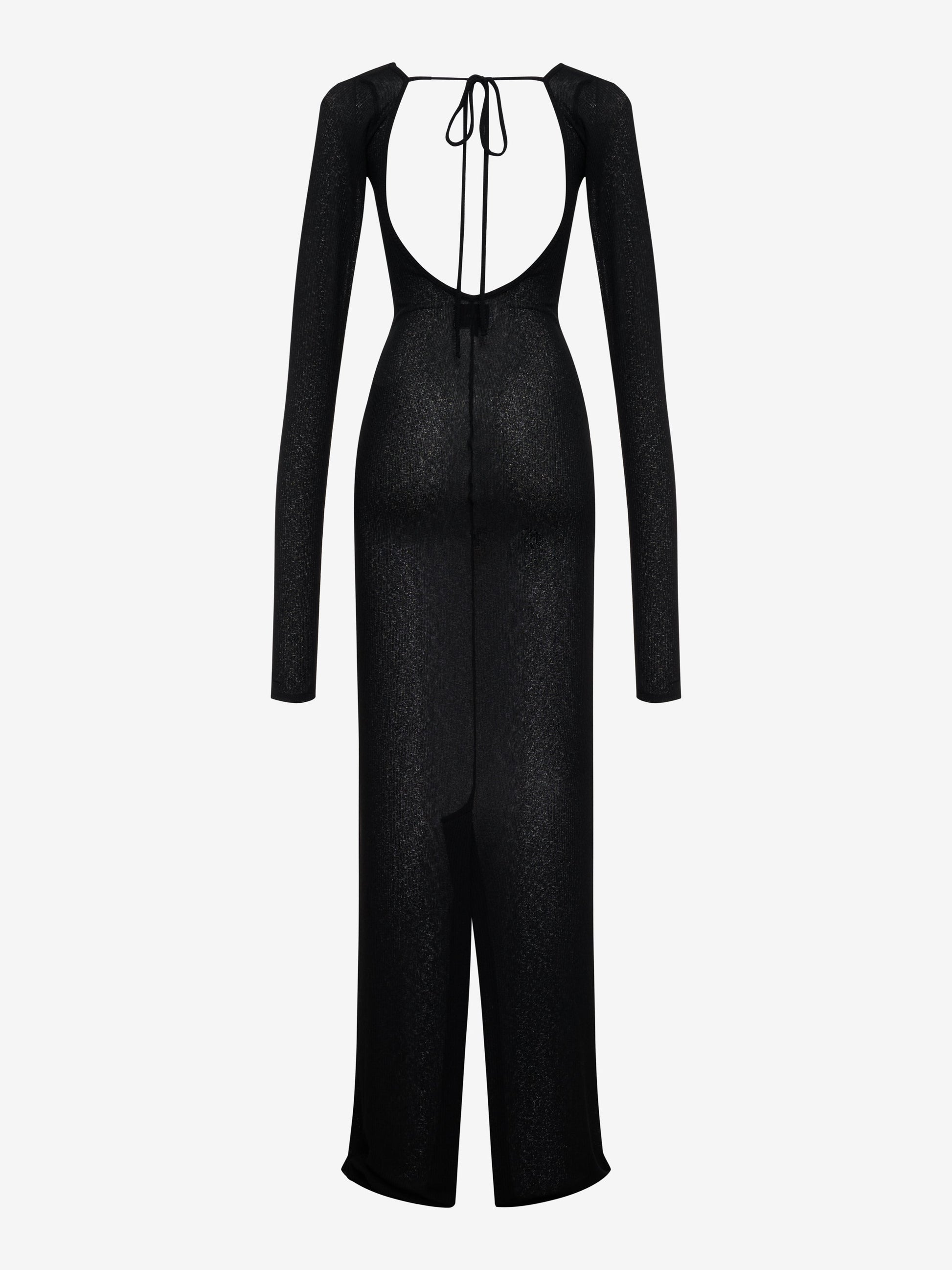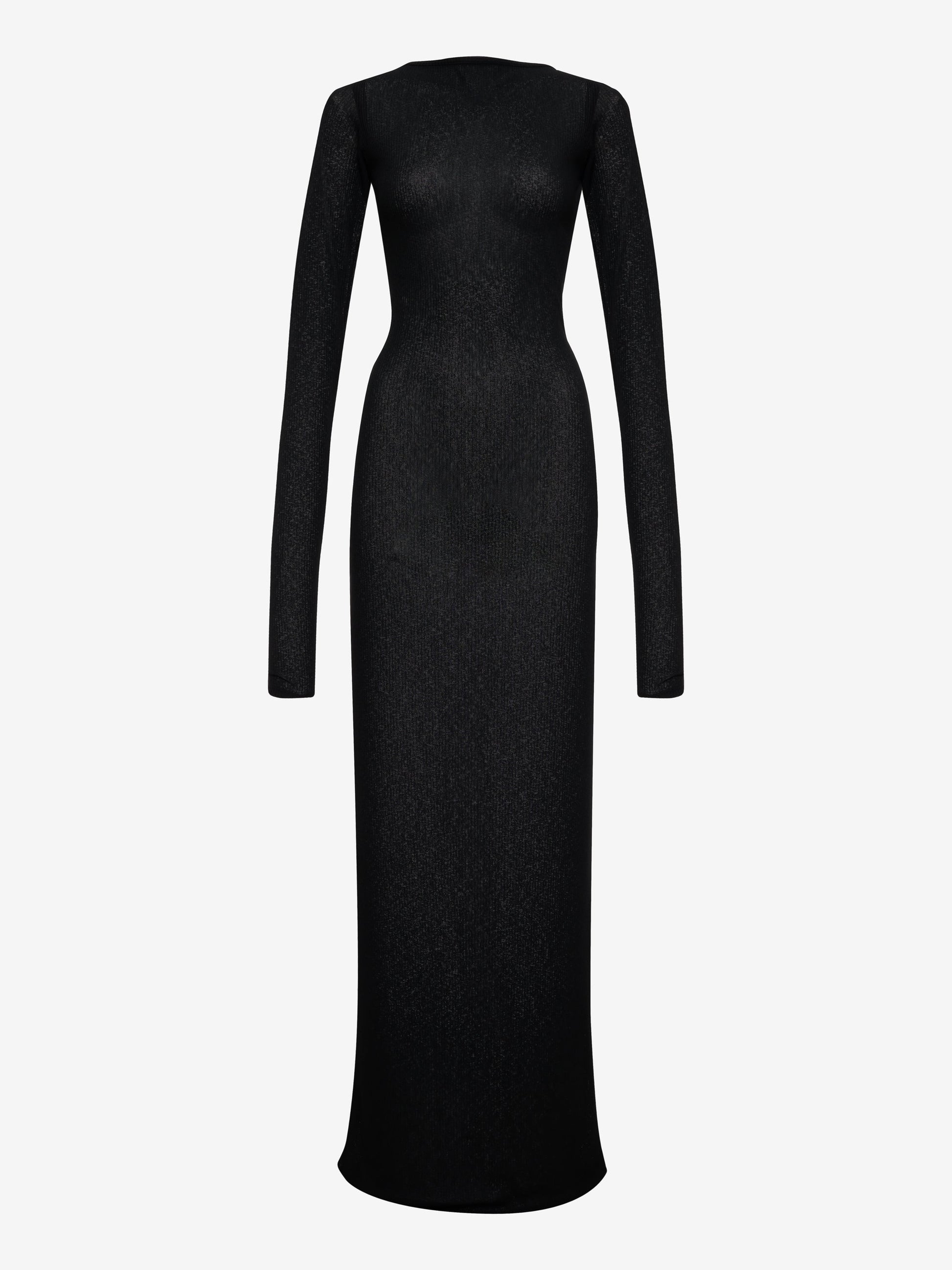 Black knit long sleeve dress with a scoop back and a simple tie-back closure, crafted from high-quality materials.