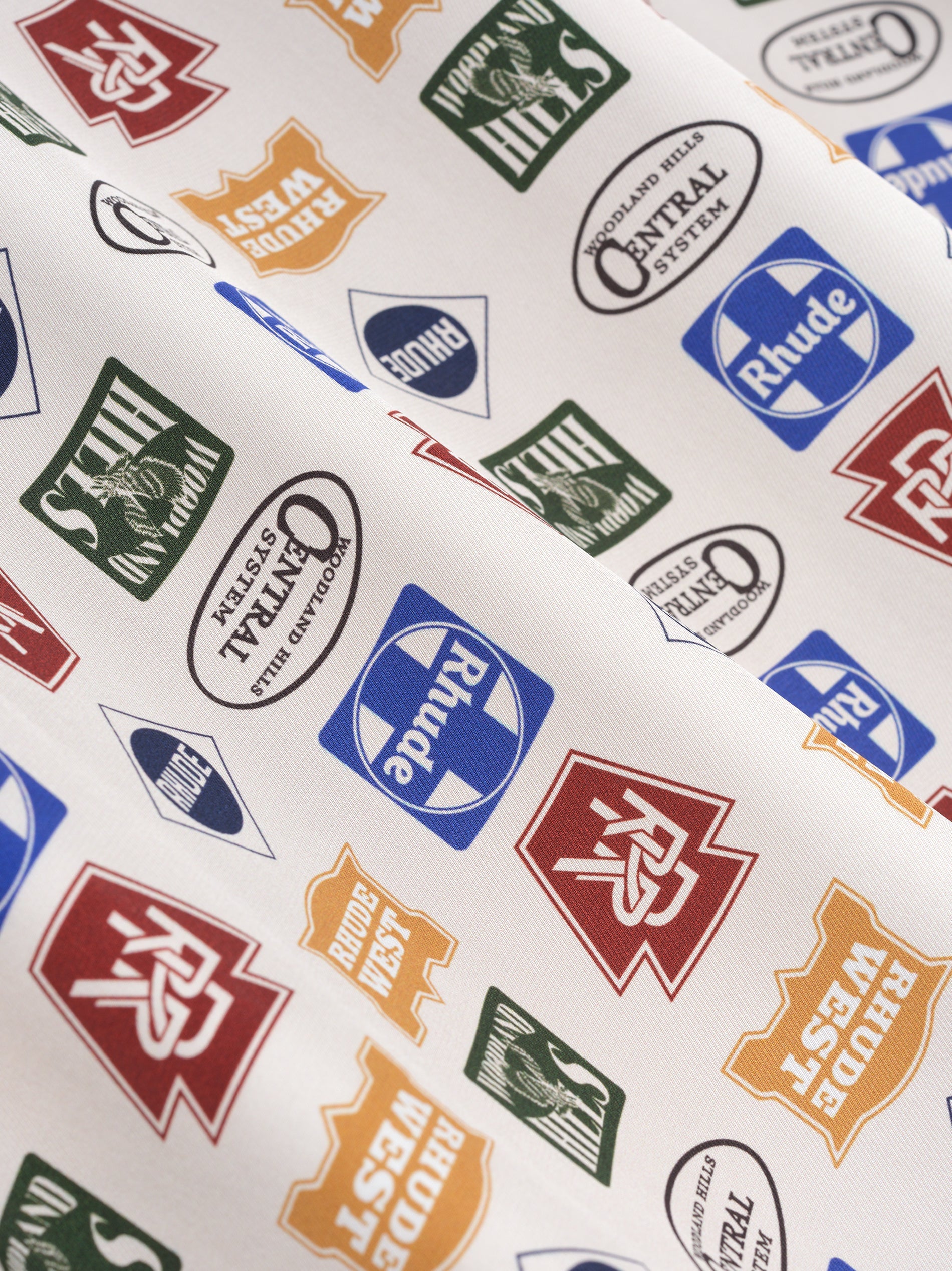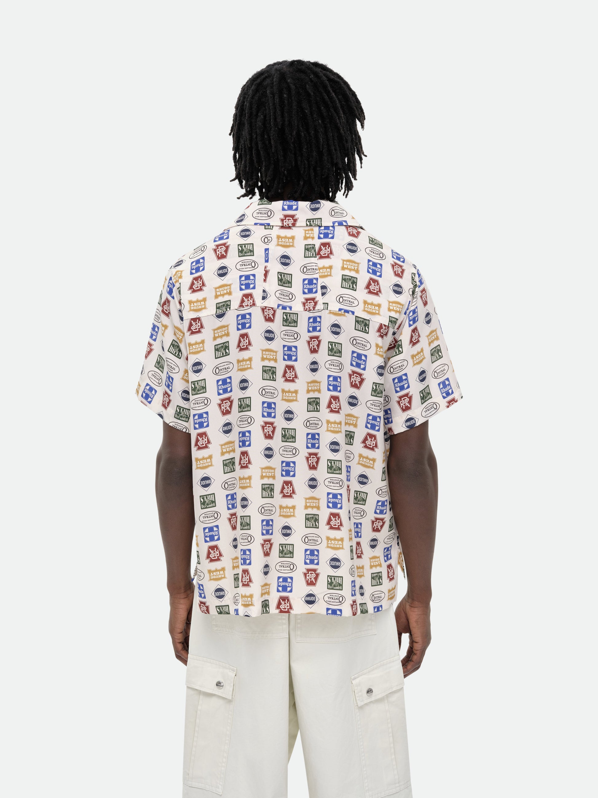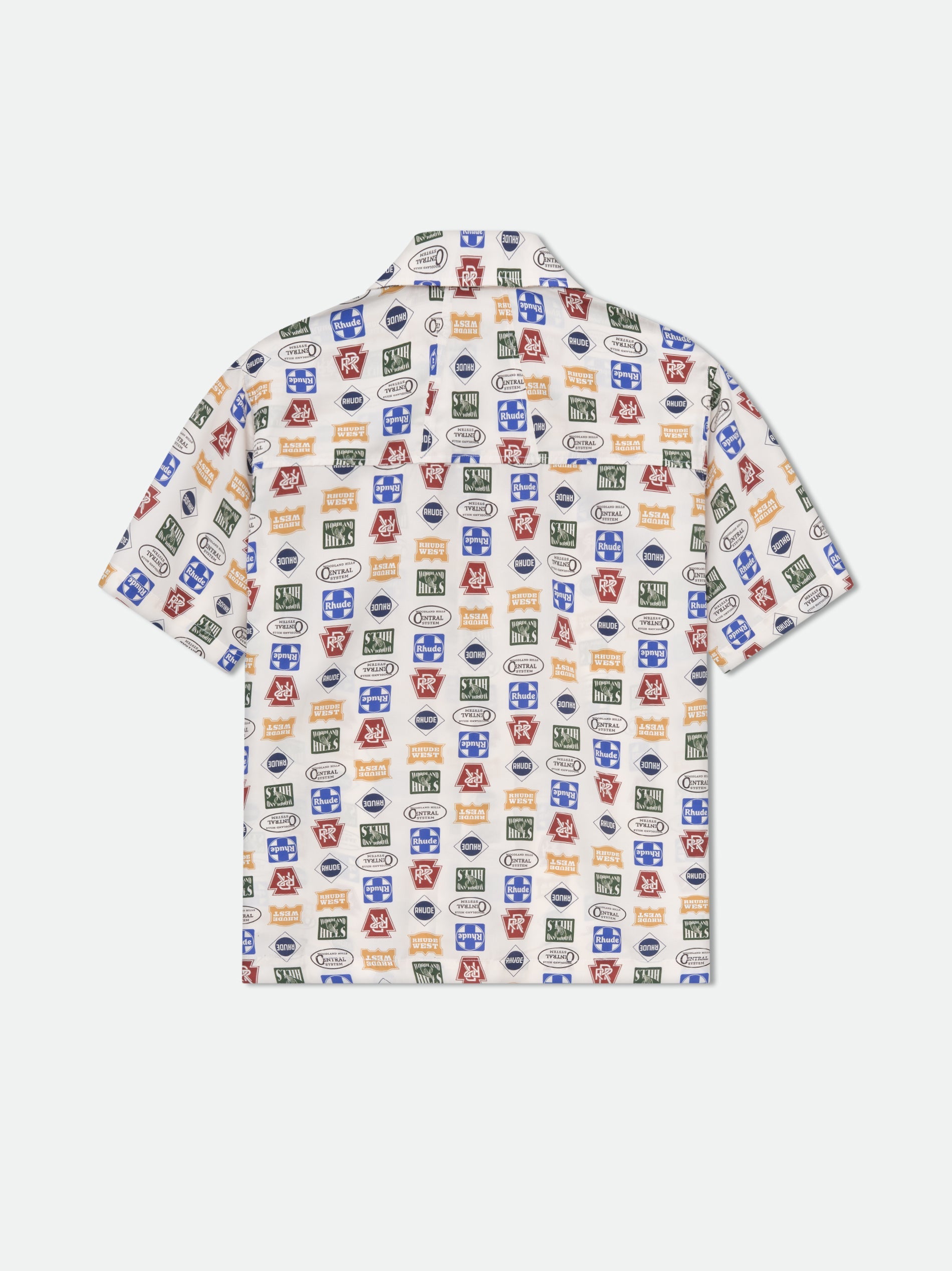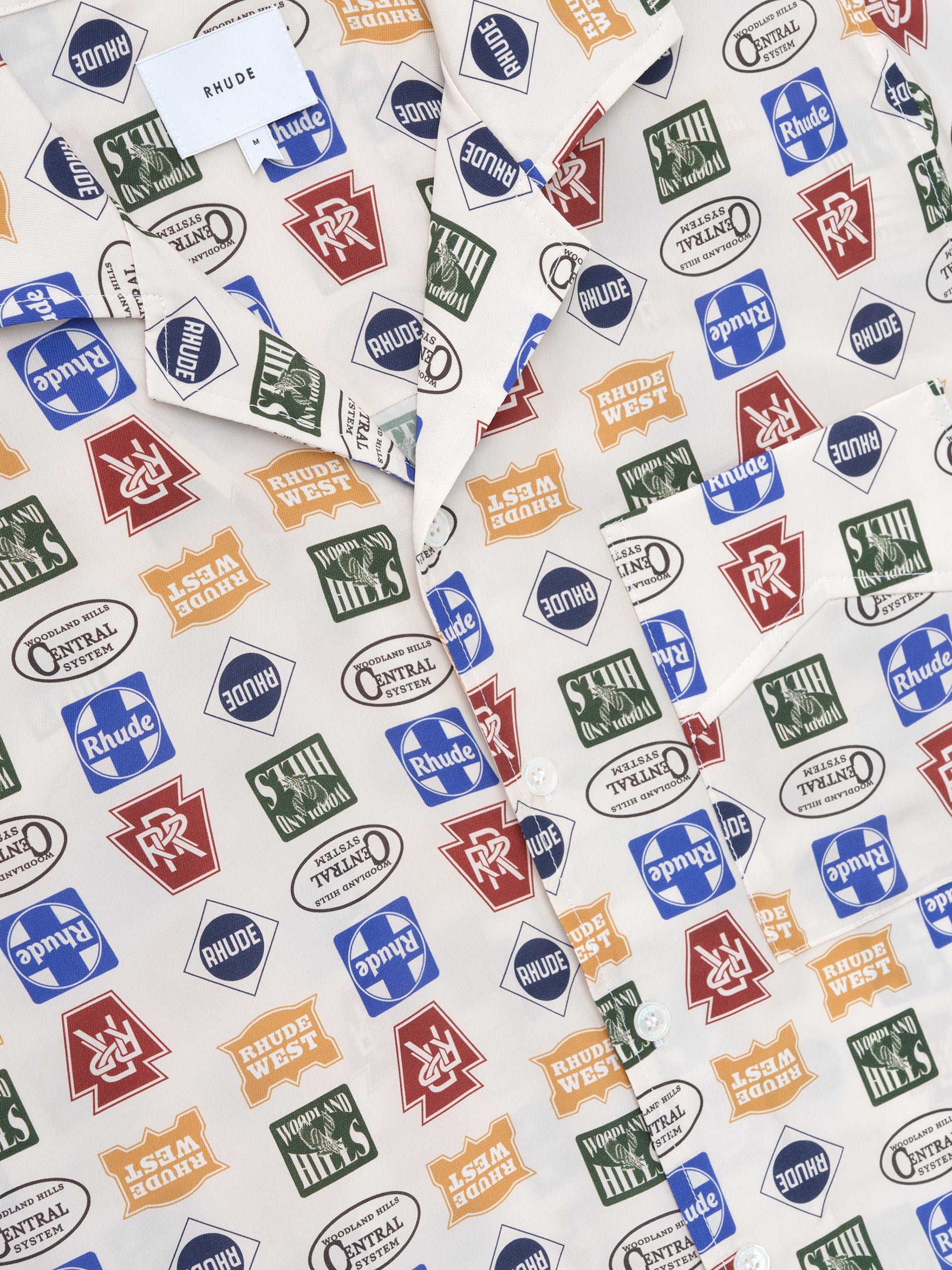 Classic button up shirt crafted from premium quality silk. Featuring a flat hem, custom button closures at front, and RHUDE trucker inspired rhude logo designs all over.